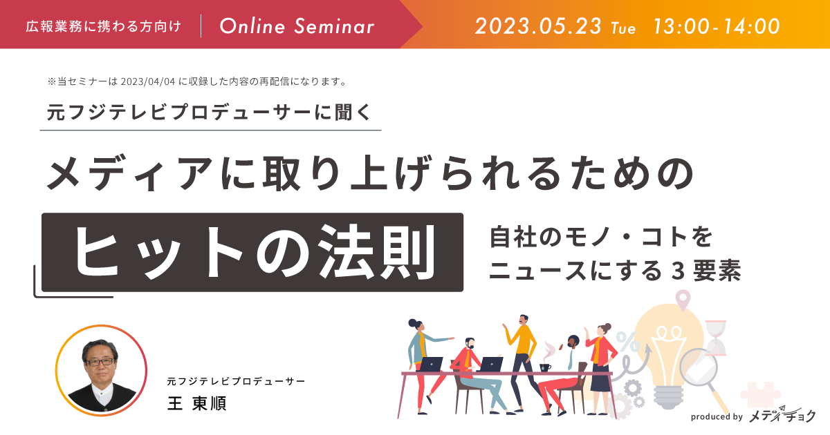 プレスリリースを配信してもなかなかメディア露出に繋がらない。そんな方々のために、元フジテレビプロデューサーである王様をお招きして、メディアに取り上げられるための「ヒットの法則」を伺います。